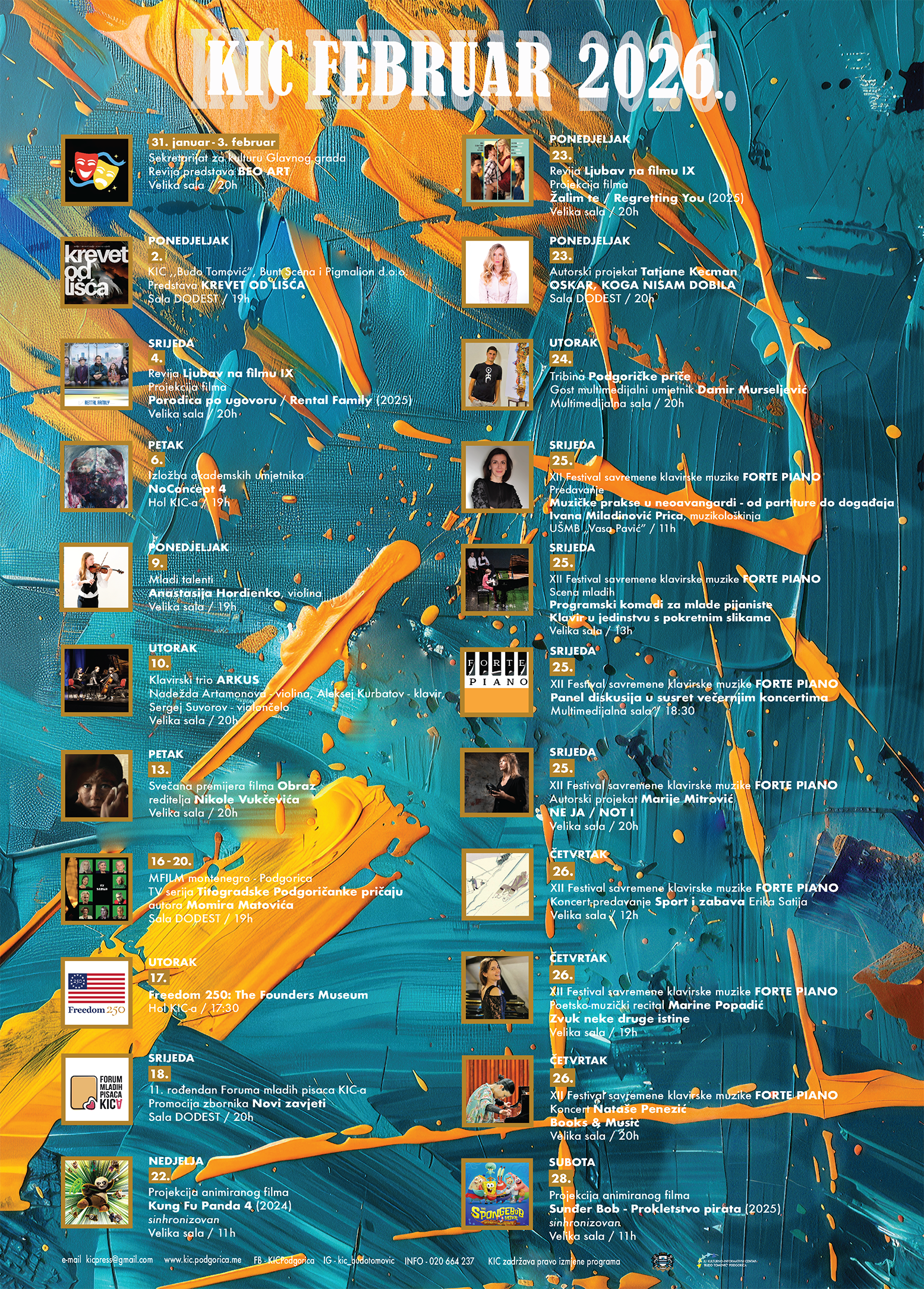 Programski sadržaji Kulturno-informativnog centra „Budo Tomović“ i tokom februara biće usmjereni na raznolikost i prije svega na kvalitet. Februar će početi sa predstavom „Krevet od lišća“, koju će publika nakon nedavne uspješne premijere, ponovo moći da pogleda 2. februara. Dio dramskog programa biće i autorski projekat Tatjane Kecman, predstava „Oskar, koga nisam dobila" koja će biti izvedena […]