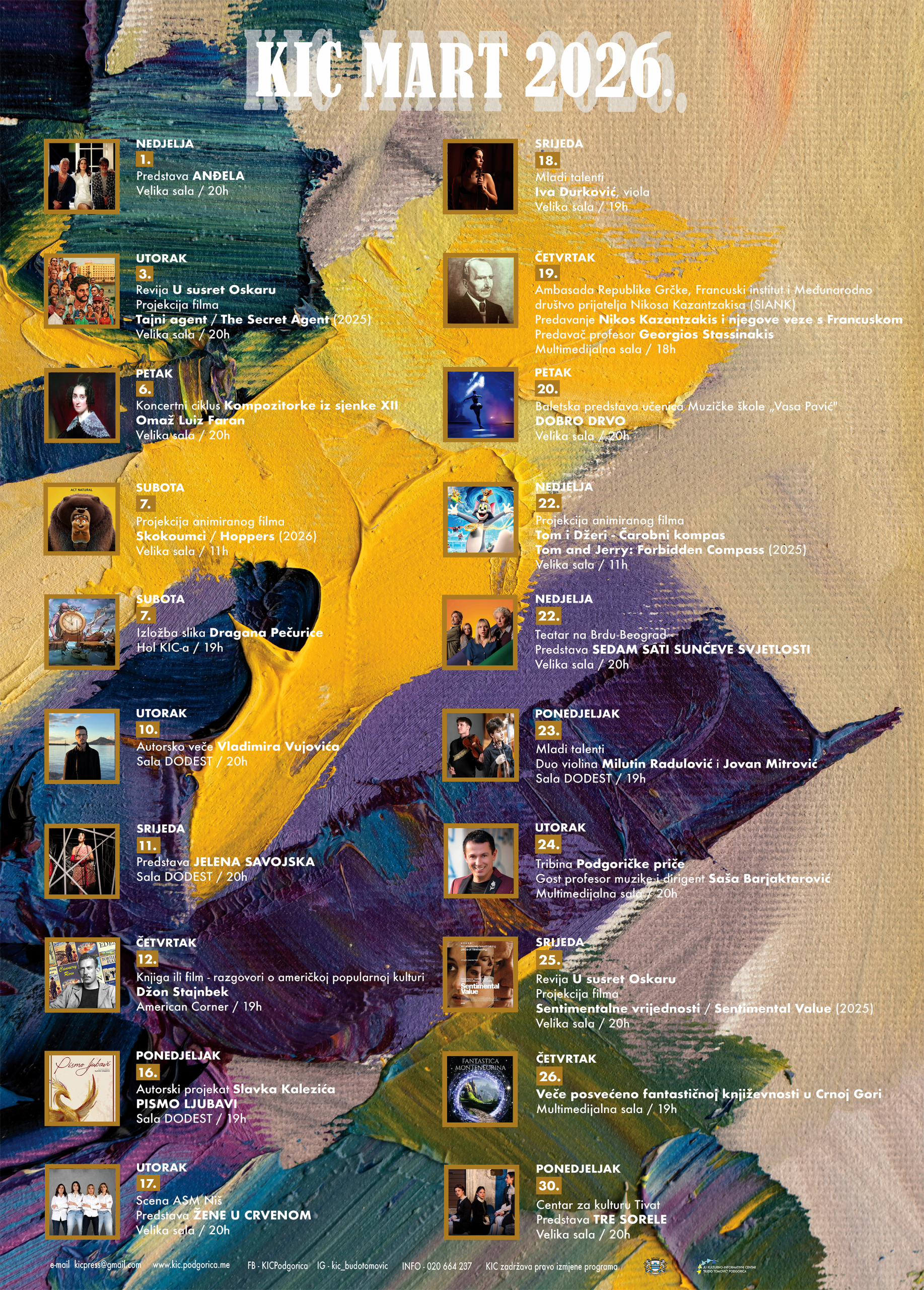Tradicionalna manifestacija Turističke organizacije Glavnog grada Podgorica “Podgorička noć” biće organizovana u četvrtak, 18. decembra, na Imanju Knaz “Aqua Palata”, sa početkom u 20:30 sati. Manifestacija se organizuje u čast obilježavanja 19. decembra – Dana oslobođenja Podgorice, a kroz cjelovečernji program prikazuje duh stare Podgorice. Nastupaju: Folklorni ansambl Šukrija Žuti Serhatlić Gost večeri: Ivana Selakov […]