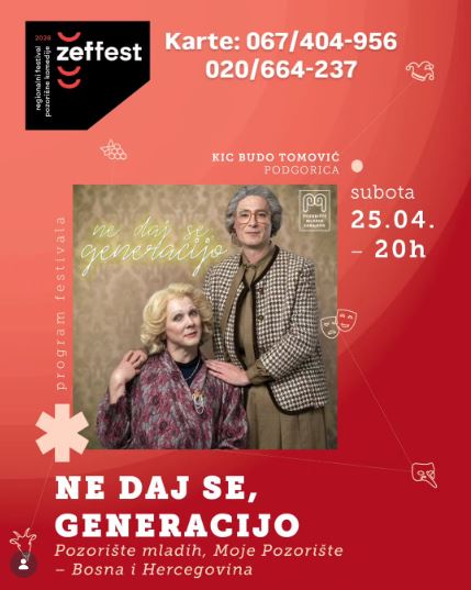 ZEFFEST: Predstava ,,Ne daj se generacijo" 25.aprila u 20h, KIC ,,Budo Tomović" Predstava prati priču o dvije prijateljice — Bebi i Ruži — koje su nerazdvojne dugi niz godina. Temelj priče je prijateljstvo, život treće dobi, svakodnevica, predrasude i društvene norme. Junakinje odlučuju da odbace nametnute obrasce, potraga za novim iskustvima i slobodom ih vodi […]