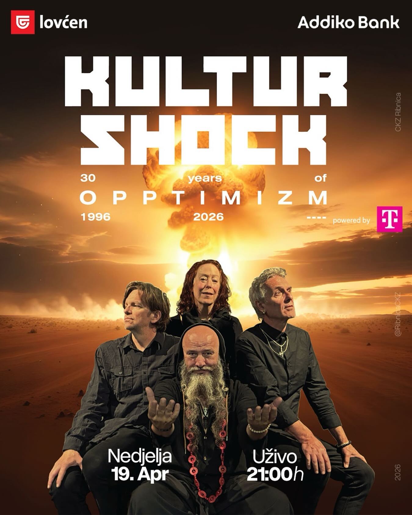 Na Evropskoj turneji - “30 years of optimmizm” KULTUR SHOCK slavi i kod nas! Nedjelja - 19.04.2026. u 21h Ulaznice su dostupne u CKZ Ribnica po cijenama: od 10.02. - 18.02. - early bird - 12€ od 19.02. - 18.04. - regular - 15€ 19.04. - doors - 20€