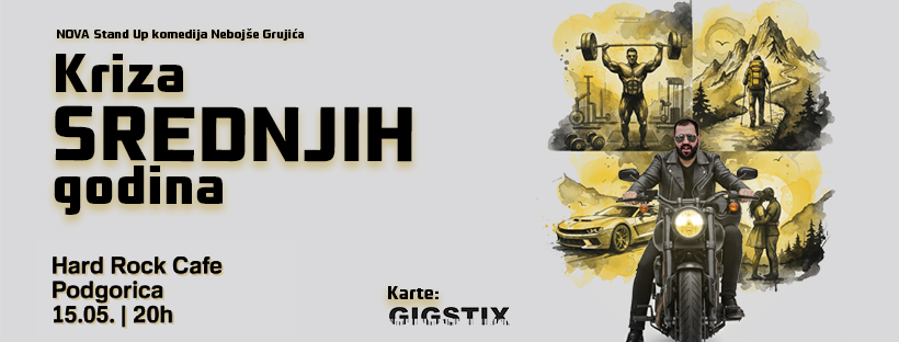 Izvođenje nove stand up komedije Nebojše Grujića "Kriza SREDNJIH godina" u Podgorici. Da li idete u teretanu i imate personalnog trenera? Planinarite li? Da niste možda hipohondar? Ovo su samo neke od tema iz predstave,a u kojoj ćete se baš vi pronaći? Ulaznice - CIJENA: 10 EUR