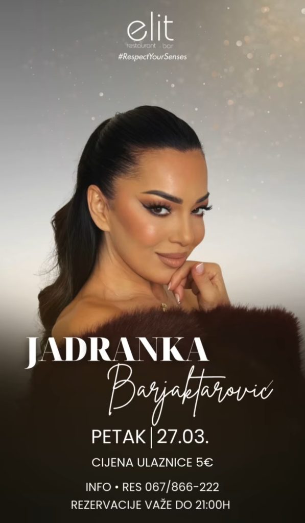 Jadranka Barjaktarović uživo u Elitu! ✨ 🎶 Petak, 27.mart 📞 Rezervacije: 067 866 222 🎫 Cijena karte: 5 € ⏰ Rezervacije važe do 21h Vidimo se u Elitu. 💫