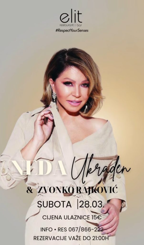 Neda Ukraden i Zvonko Rajković uživo u Elitu! ✨ 🎶 Subota 28.mart 📞 Rezervacije: 067 866 222 🎫 Cijena karte: 15 € ⏰ Rezervacije važe do 21h Vidimo se u Elitu. 💫