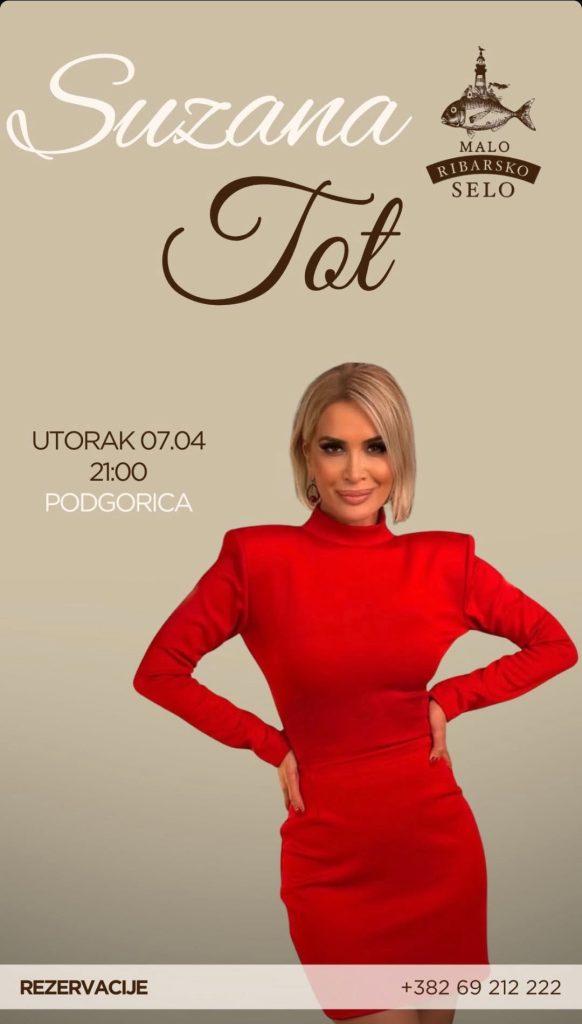 Suzana Tot nastupiće 7.aprila u restoranu ,,Malo ribarsko selo” od 21h!🎶🎤 🎶 Vidimo se u restoranu ,,Malo Ribarsko selo” 🥂🥂🥂