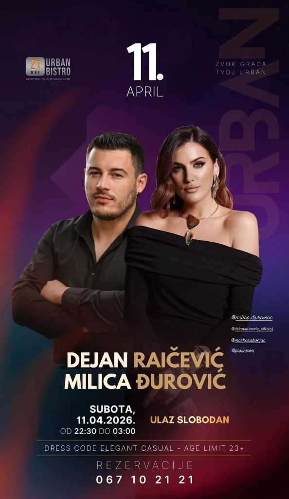 U subotu, 11.aprila, u ,,21 MNE Urban Bistro”-u zabavljaće vas Dejan Raičević & Milica Djurovic 🎟️slobodan ulaz 📌 Dress code: Elegant Casual🔞 Ulaz 23+📲 Rezervacije: 067 10 21 21 Urban – mjesto gdje grad diše muzikom. ✨