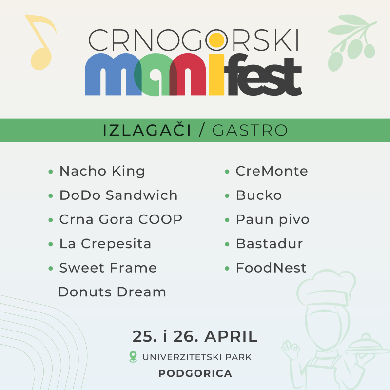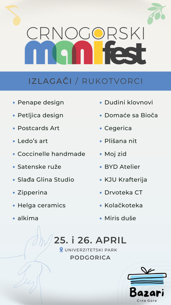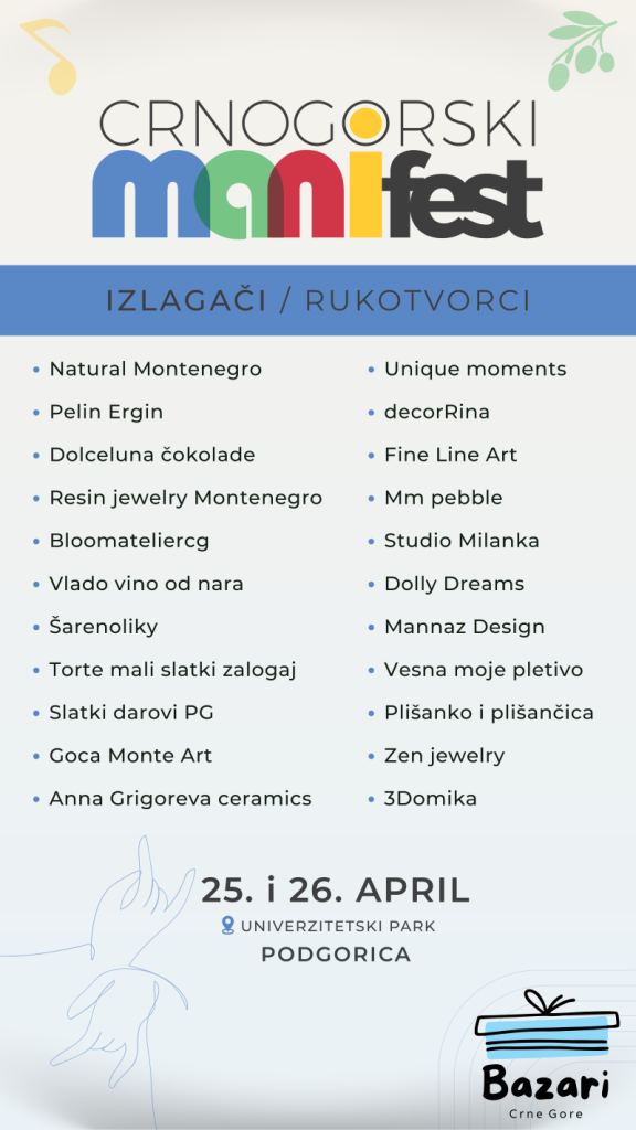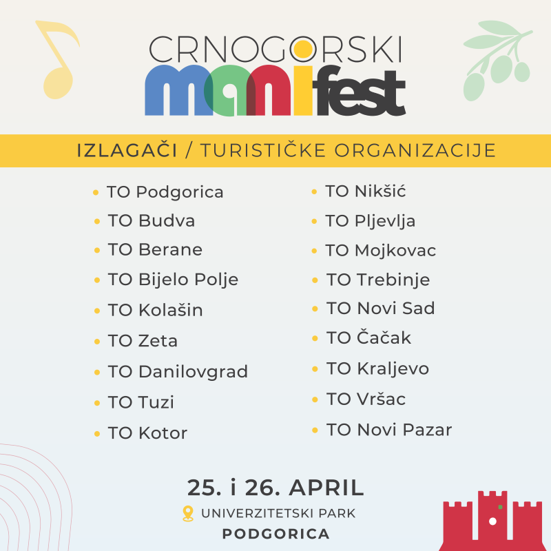 Pozivamo vas da 25. i 26. aprila posjetite Univerzitetski park u Podgorici u periodu od 11 do 20 časova i uživate u Crnogorskom Manifestu – jedinstvenom događaju koji slavi bogatstvo turističke ponude Crne Gore i regiona.